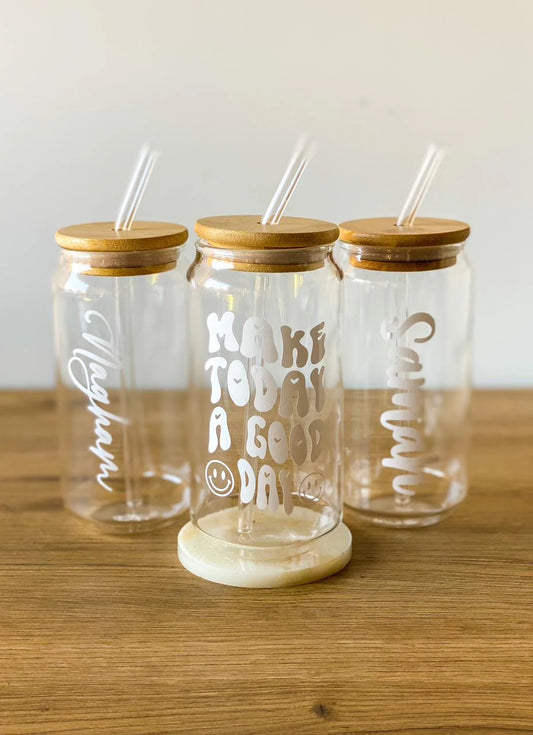 Personalized Square Glass Tumbler with Bamboo Lid & Straw