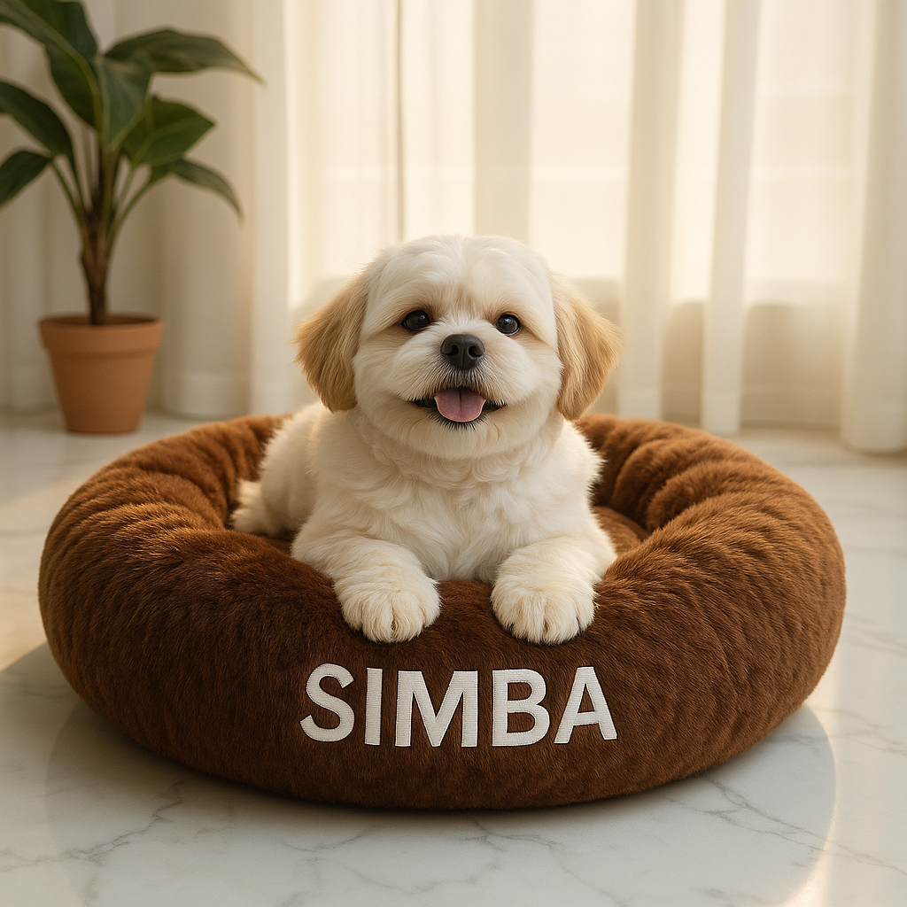 Personalised Donut Bed, sized 19"x19"x5", offers a plush retreat for small dogs and cats. Crafted with ultra-soft brown faux fur, it provides a comforting texture that soothes pets and helps reduce anxiety. Its circular design encourages curling up, promoting restful, deep sleep. Ideal for pets needing extra comfort and security, this bed combines softness and support to enhance your pet’s relaxation and well-being.